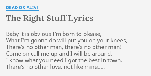 You got the right stuff baby. Найди текст You Got It The Right Stuff от New Kids on the Block и другие произведения New Kids on the Block. You got the right stuff baby Love the way you turn me on You got the right stuff baby Youre the reason why I sing this song All that I needed was you Oh girl youre so right And all that I wanted was you You made all my dreams come true Oh oh oh oh oh oh oh oh oh. Youre the reason why I sing this song.